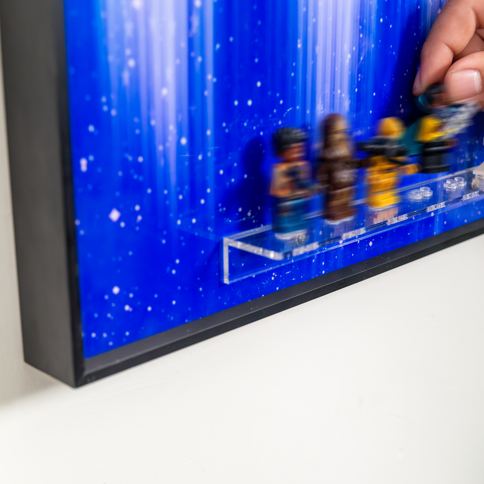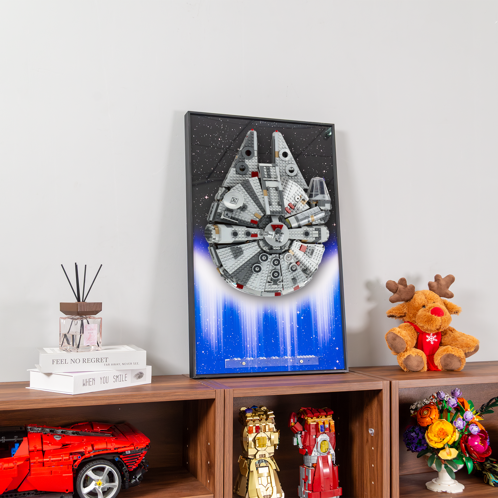 Featuring a blue Star Wars hyperspace backdrop with starfield and light-speed effects, this frame amplifies the dynamic, cinematic energy of the 75257 Millennium Falcon. The acrylic minifigure shelf allows you to display the full character lineup, . Supports both wall-mounted and tabletop display, giving collectors flexible placement options for any space.