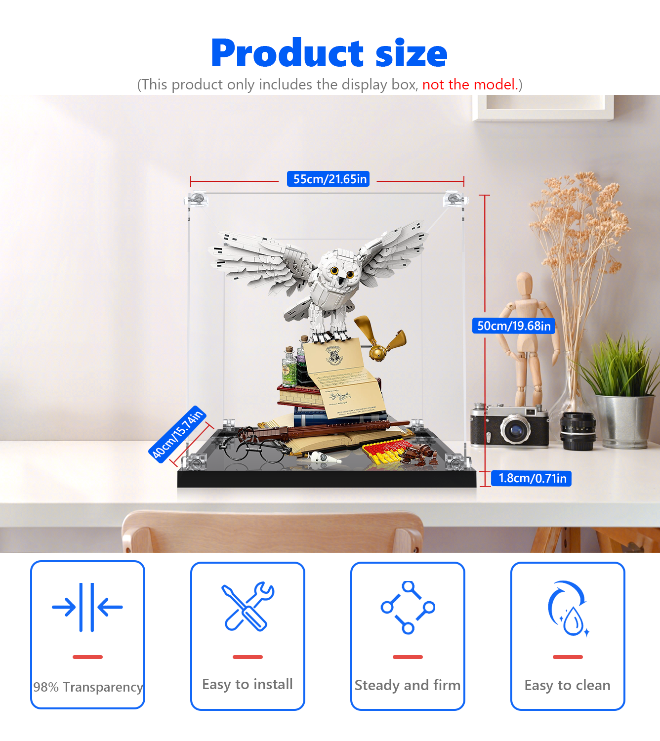 Højmetning HD baggrund tilføjer dybde og realism, hvilket skaber et virkelig imponerende display. Perfekt designet til denne samlereudgave, måler vitrinen 55 × 40 × 50 cm (21,65 × 15,75 × 19,69 tommer), hvilket giver rigelig plads, mens den fastholder en elegant, kompakt profil.