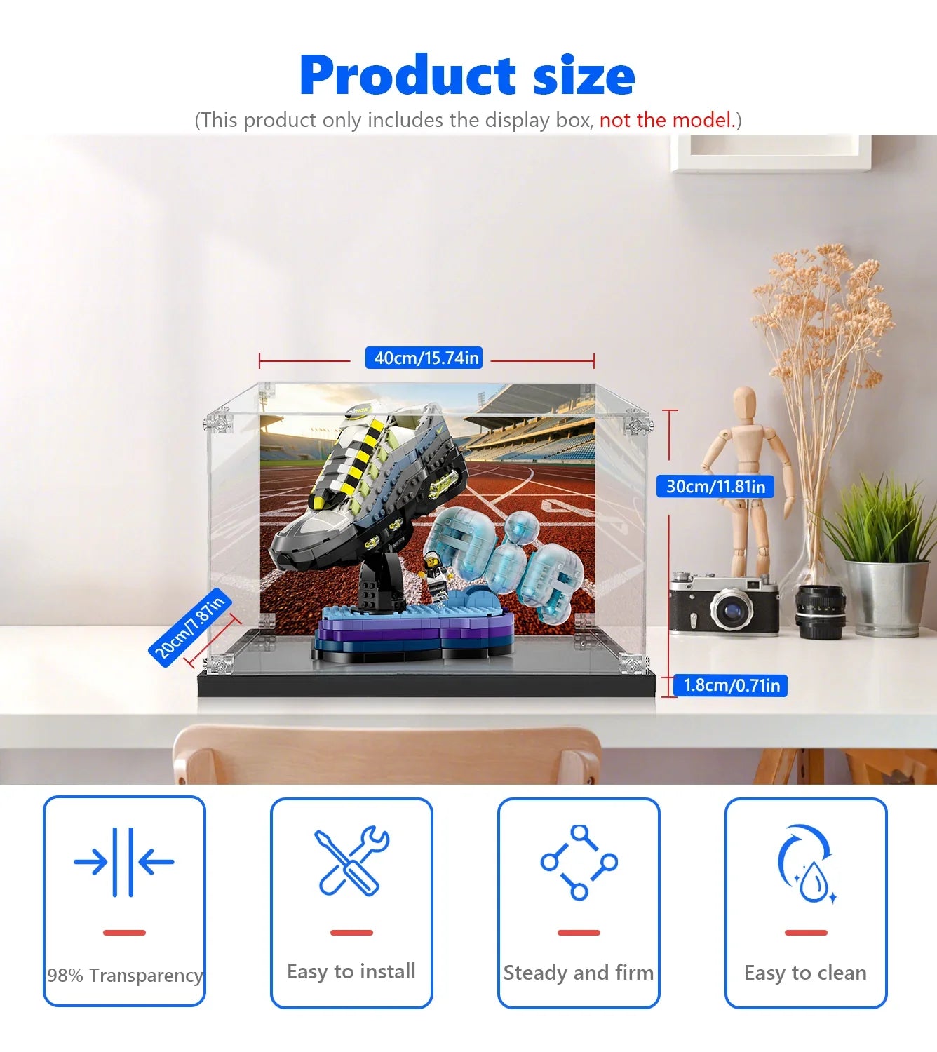 Opmerking: Deze aanbieding betreft de acryl displaydoos alleen. De LEGO® Nike Air Max 95 set wordt apart verkocht. Verwijder vóór de montage het beschermfolie van beide zijden van de panelen voor optimale helderheid.