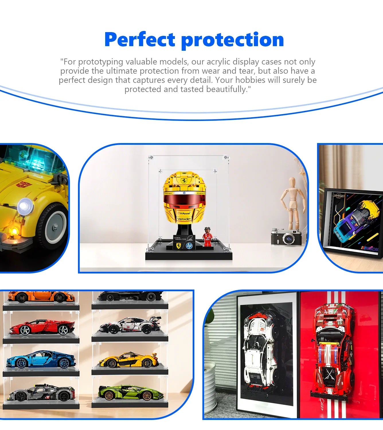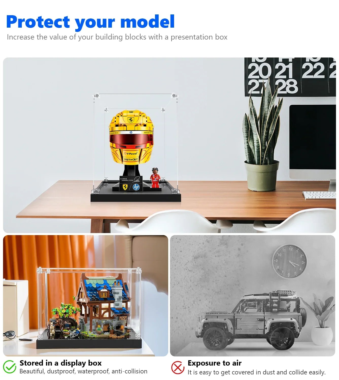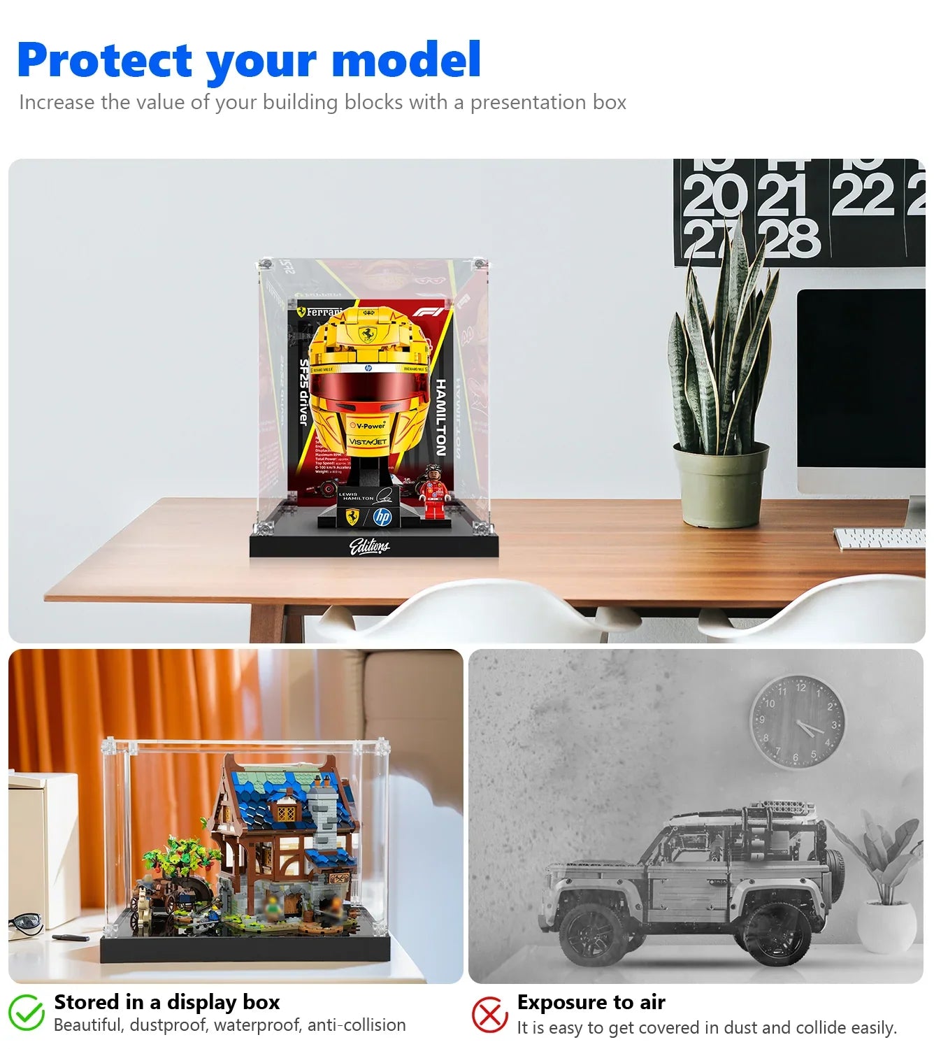 F1 fans know that the details matter. From the H.P. branding to the signature Hamilton yellow accents, our lego display case ensures no detail is lost to glare or dust. While many display cases for lego are generic, this unit is sized specifically to create a professional "gallery" look for helmet sets. It’s the perfect companion for collectors who also own the ferrari sf 24 or other race car legos.