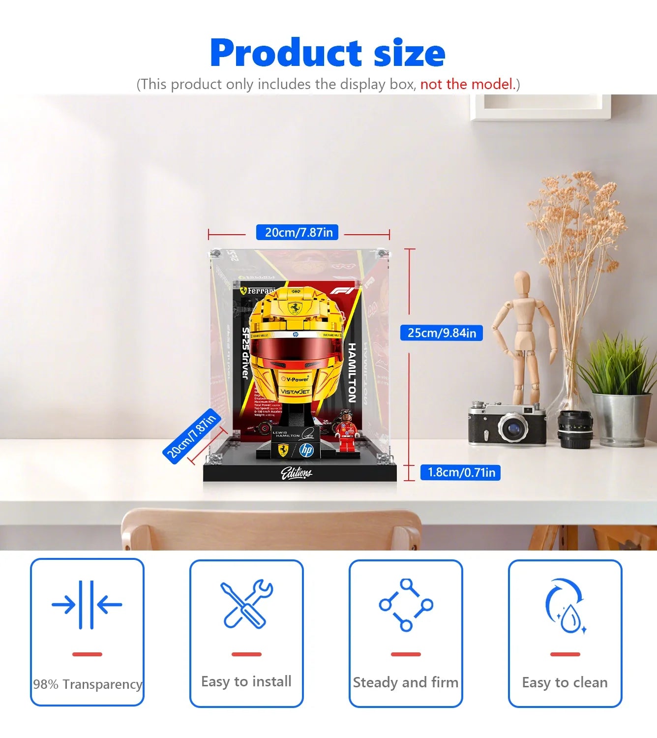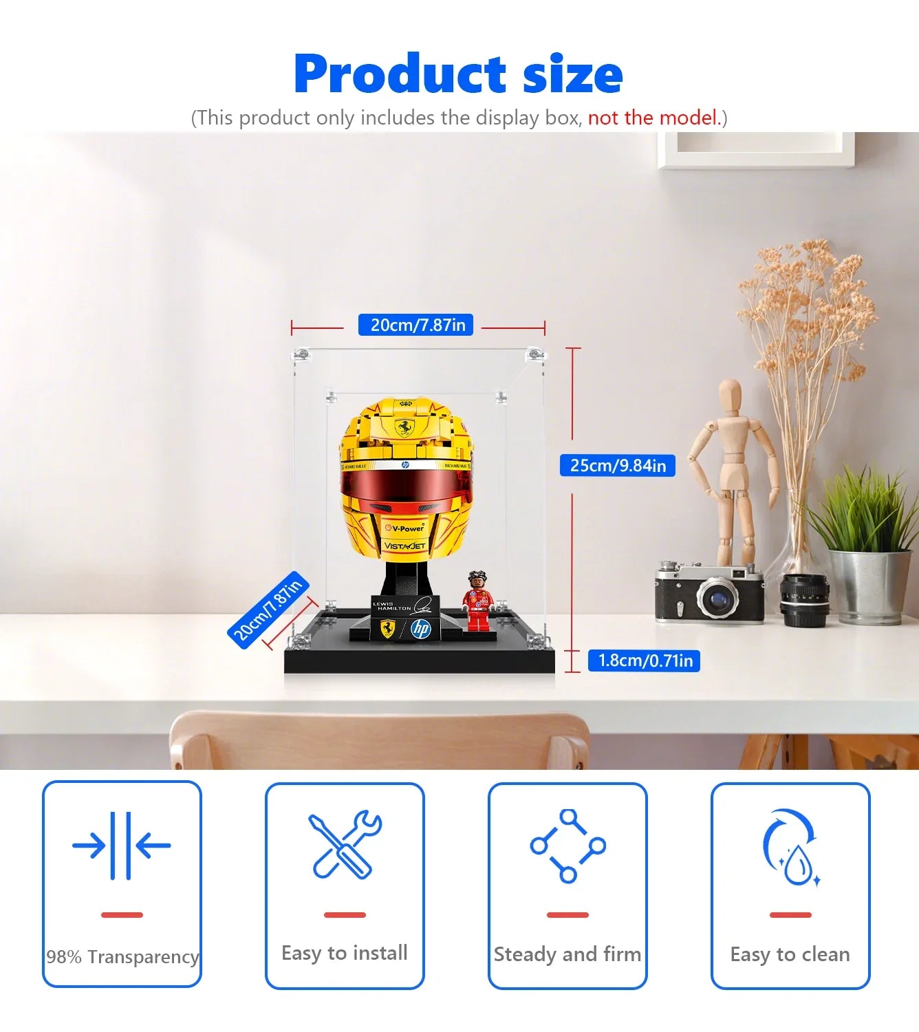 Note: This listing is for the acrylic display box only. The LEGO® #43022 Ferrari Lewis Hamilton Helmet set is sold separately. Please ensure you remove the protective film from both sides of every panel before assembly to achieve the signature crystal-clear finish. Find more premium display cases for lego at icuanuty.com.