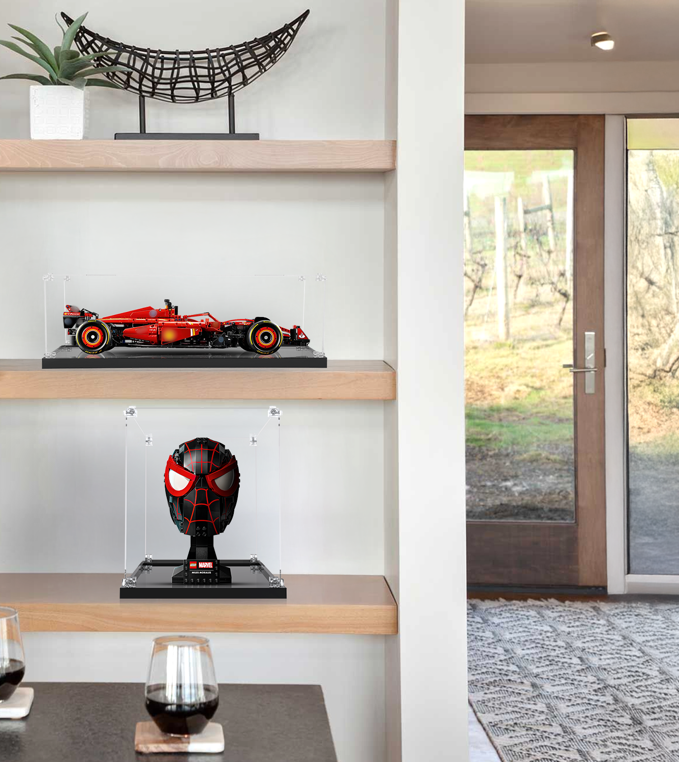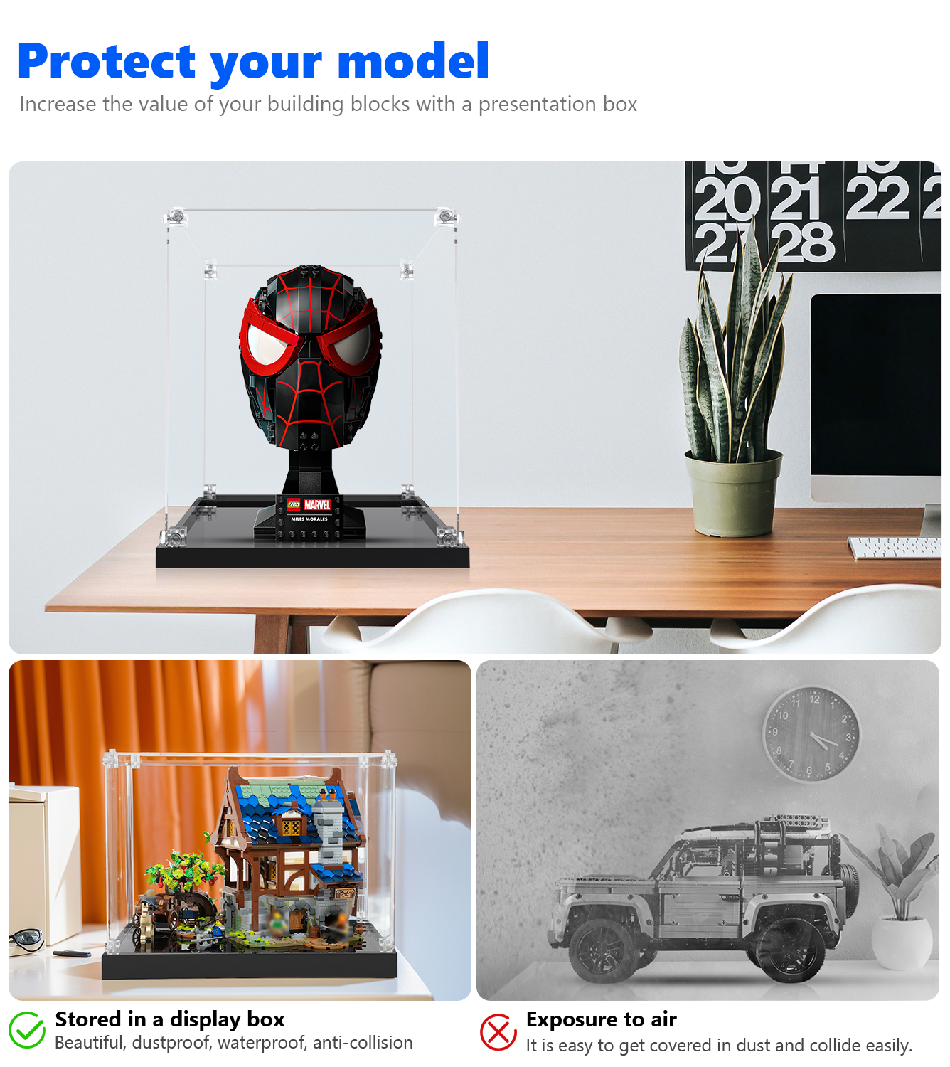 Crafted from 98% ultra-clear 3mm acrylic, it offers museum-grade transparency and dust-free protection, ensuring your Miles Morales mask remains vibrant and flawless for years. The integrated one-piece base delivers enhanced stability and a seamless look — keeping your LEGO® masterpiece firmly in place while emphasizing every heroic detail.