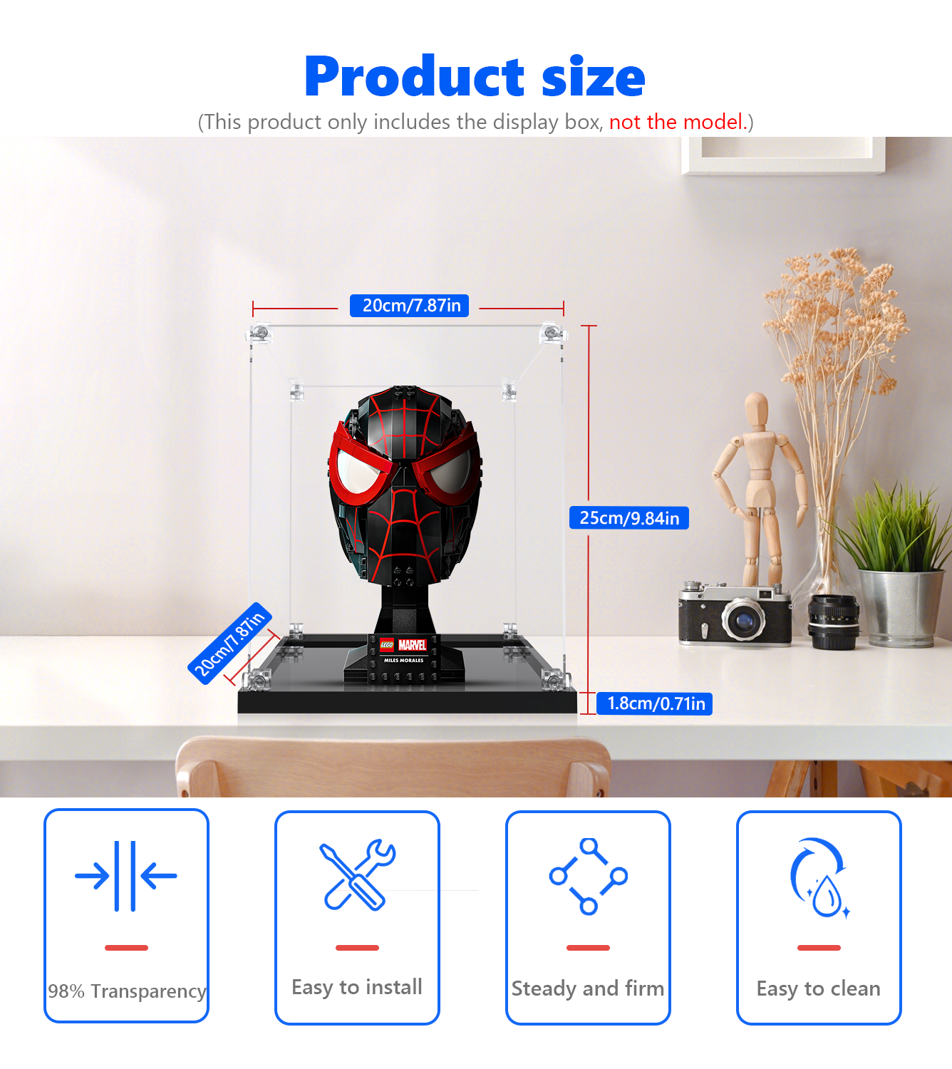 Precisely engineered to fit the LEGO® Marvel Miles Morales' Mask 76329, this display case measures 20 × 20 × 25 cm (7.87 × 7.87 × 9.84 in), offering a 360° unobstructed view of your build from every angle.