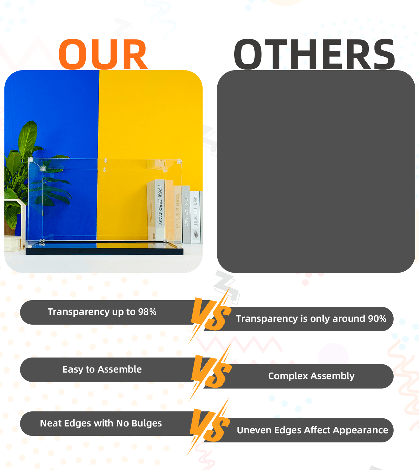 A: In order to avoid plate damage, our plates have protective films on both sides, and there will be burrs on the edges of individual plates after cutting production. This is a normal situation and is not a quality problem. Tearing off protective films, plate is clear and transparent.
